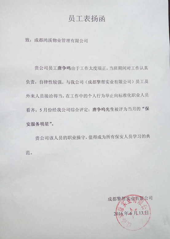 公司各部门、项目部:在全面推进精品服务及个性化服务活动中,公司员工积极响应,工作兢兢业业,服务水平持续提升。在活动中,涌现出一批业主满意、表现突出的员工。6月14日,我司收到了成都擎帮实业有限公司对驻场秩序维护员唐争鸣同志的书面表扬函,对唐争鸣同志在工作中认真负责、自律性强的工作态度及良好的职业操守表示高度的赞扬与肯定...